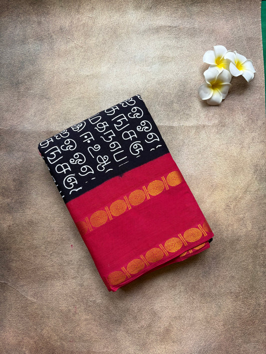 Tamil Letter Printed Sungudi Saree – Black with light Lemon Yellow Border