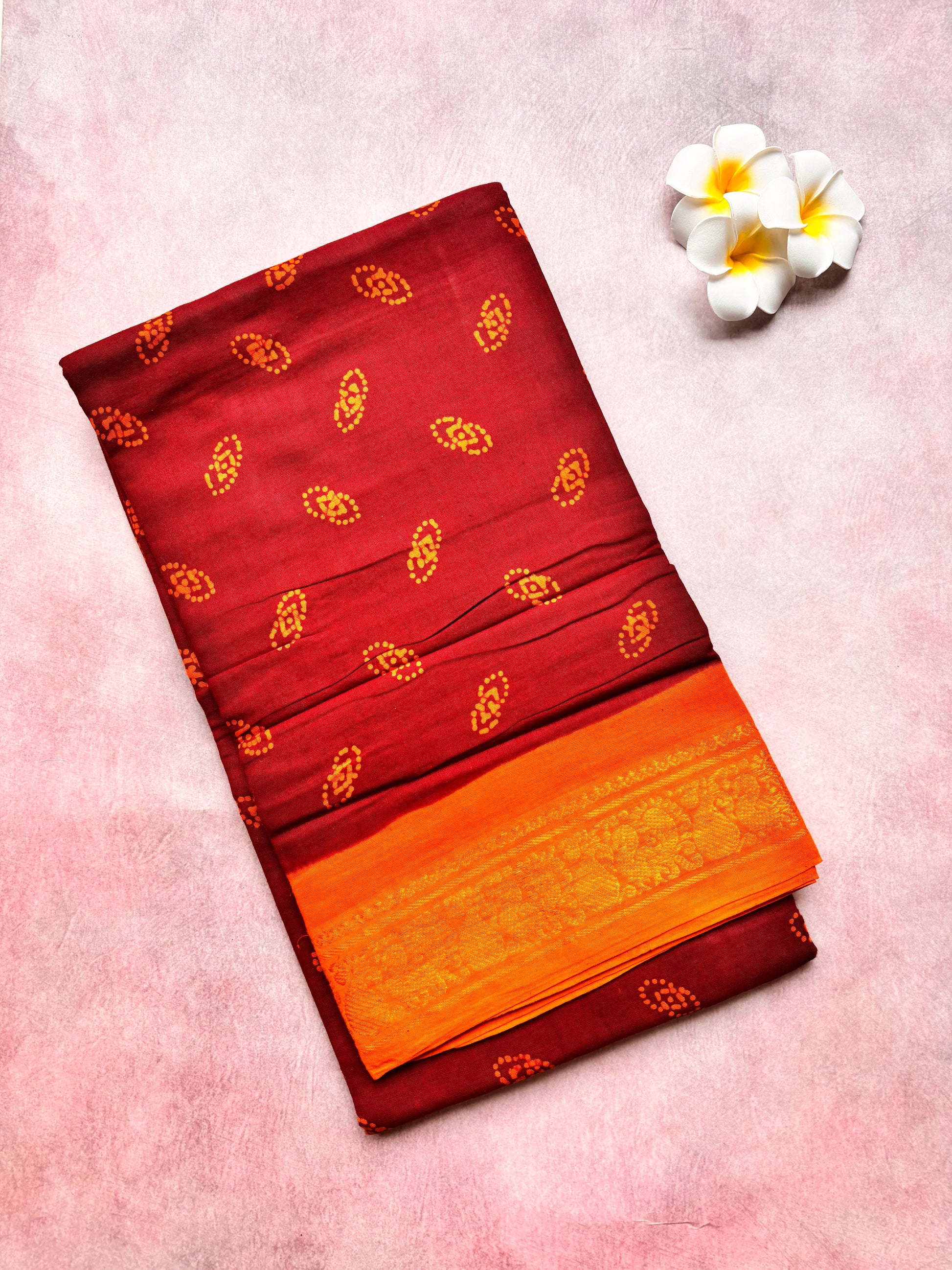Authentic Soft Sungudi Cotton Saree – Maroon with Contrast Orange Blouse