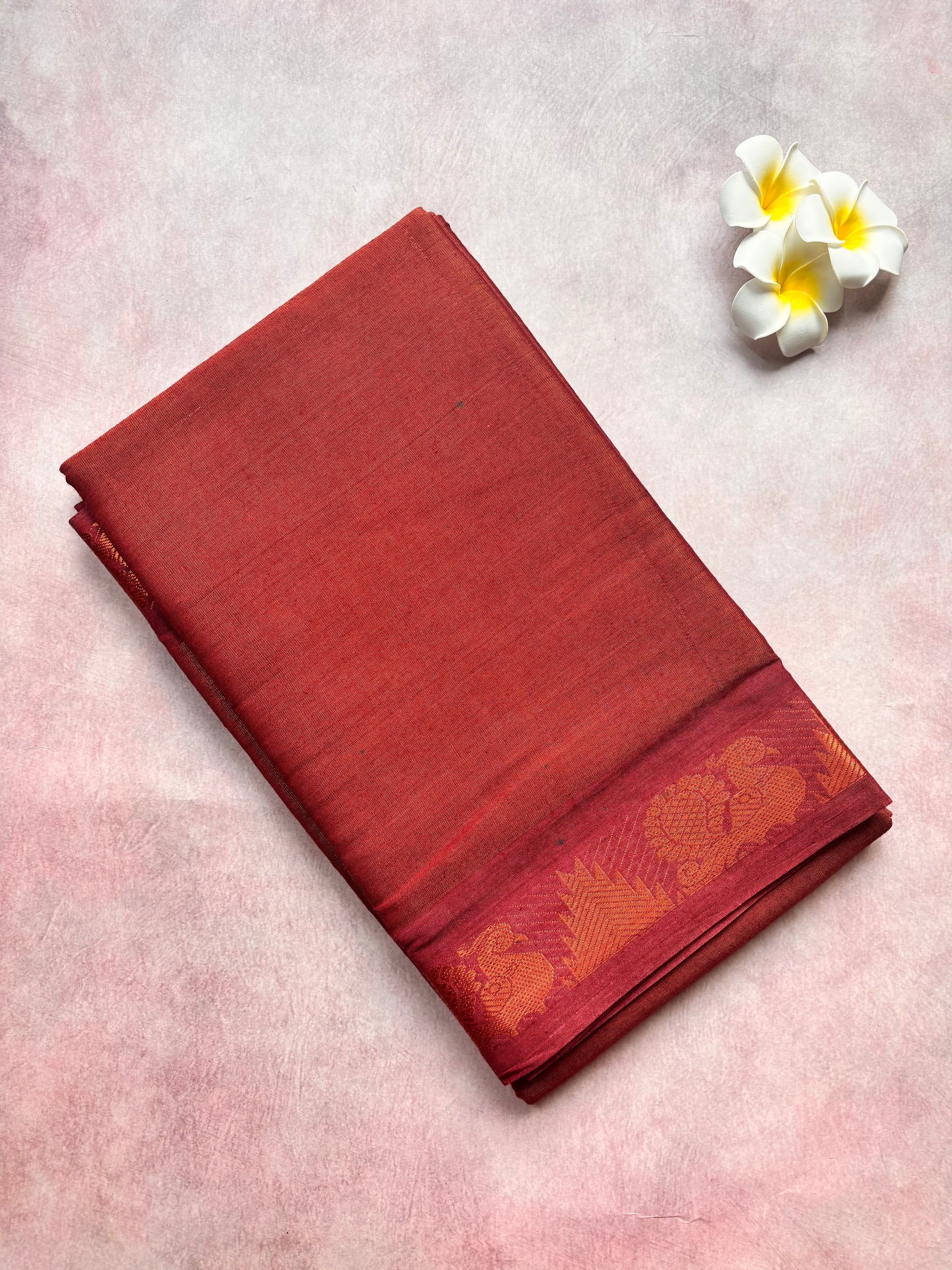 Experience the elegance of traditional Madurai craftsmanship with this Copper Maroon Tissue Sungudi Saree. Woven with soft cotton and a subtle tissue sheen, this saree combines comfort and festive charm. The small border design adds a classy, minimalist finish—perfect for women who prefer lightweight, easy-to-wear sarees for office, travel, and daily use.