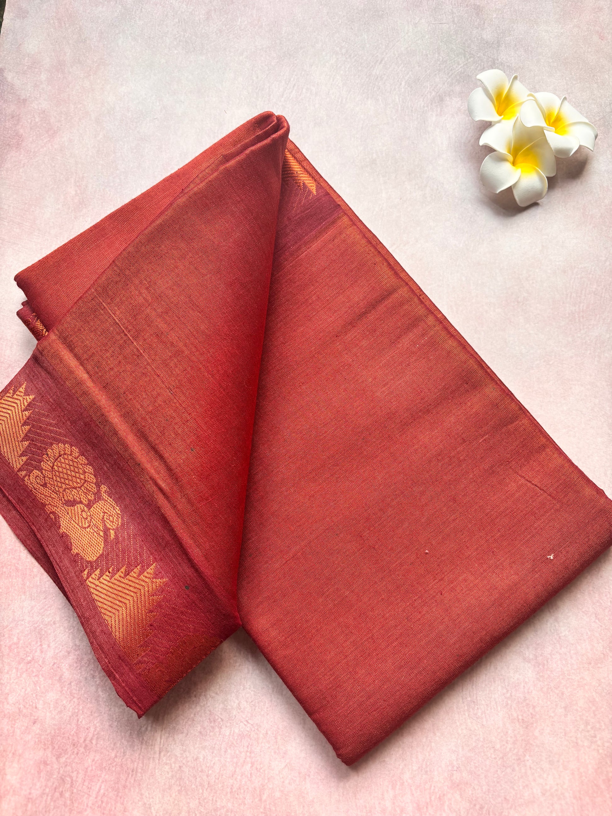 Hand-tied and hand-dyed using the authentic Sungudi technique, this saree features rich maroon hues with a copper shine, giving it a premium look while maintaining breathable comfort. Ideal for gifting, special occasions, and everyday elegance.