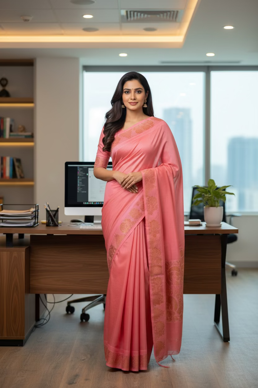 This saree combines the comfort of cotton with the glow of tissue. The pink tone adds softness, while the Sungudi craftsmanship ensures durability and traditional beauty. A perfect choice for women who prefer effortless elegance.