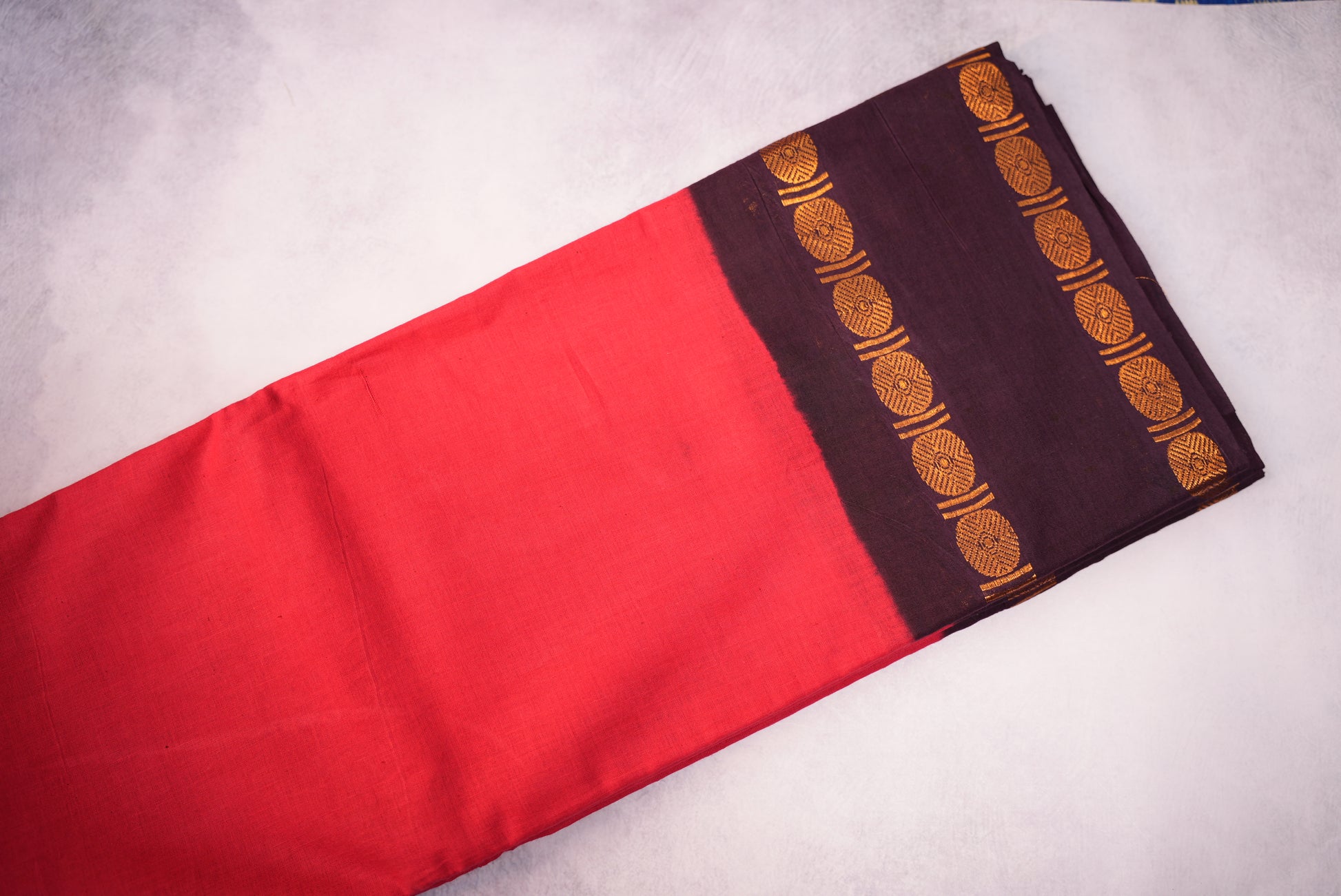 Red Sungudi Saree with Brown Border and Rudraksha Detailing