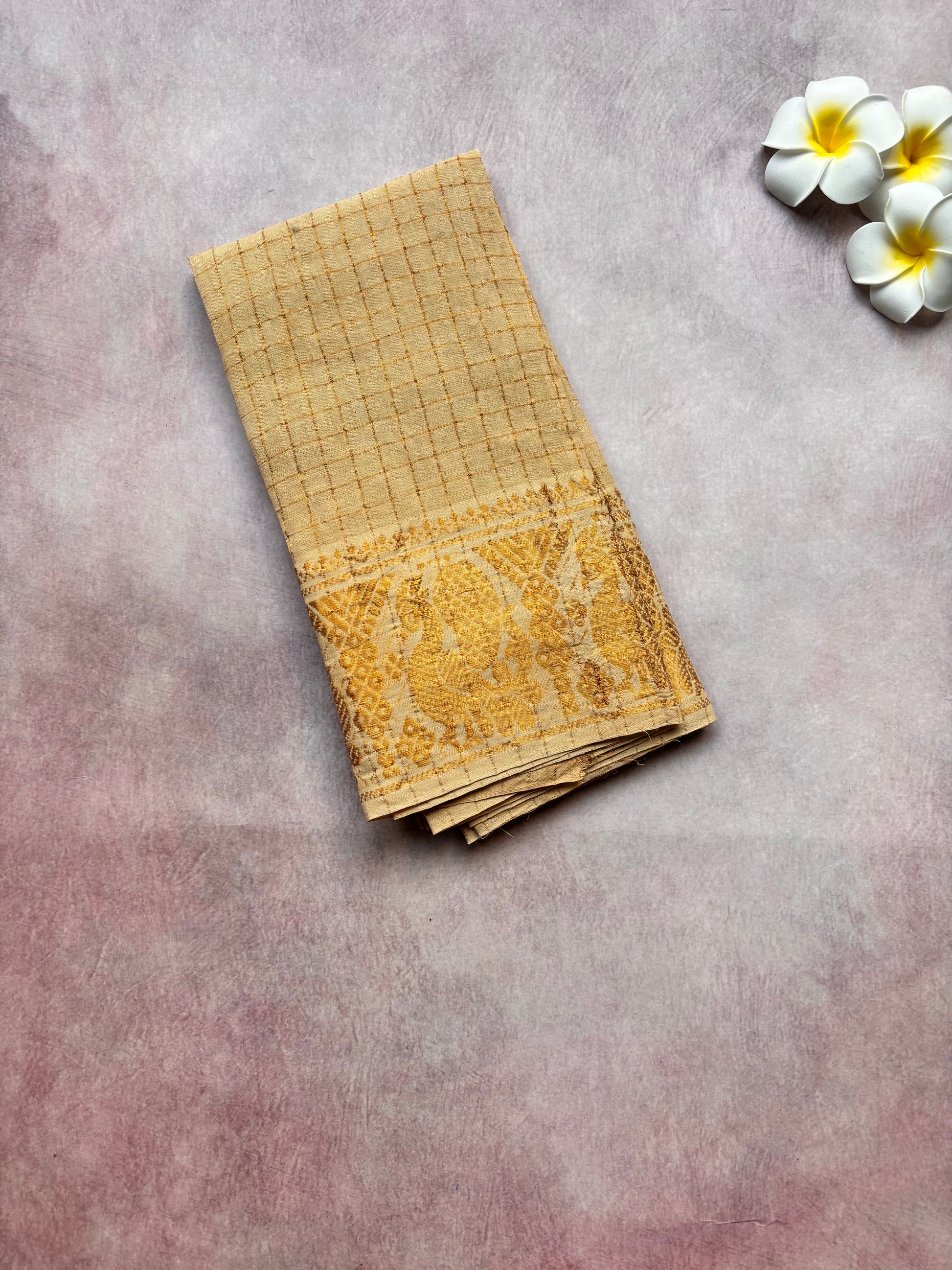 The deep red body exudes confidence and grace, while the delicate cream-white border adds a touch of calm sophistication. Perfect for office wear, festive gatherings, or traditional occasions, this saree is a graceful choice for women who love comfort with heritage style.