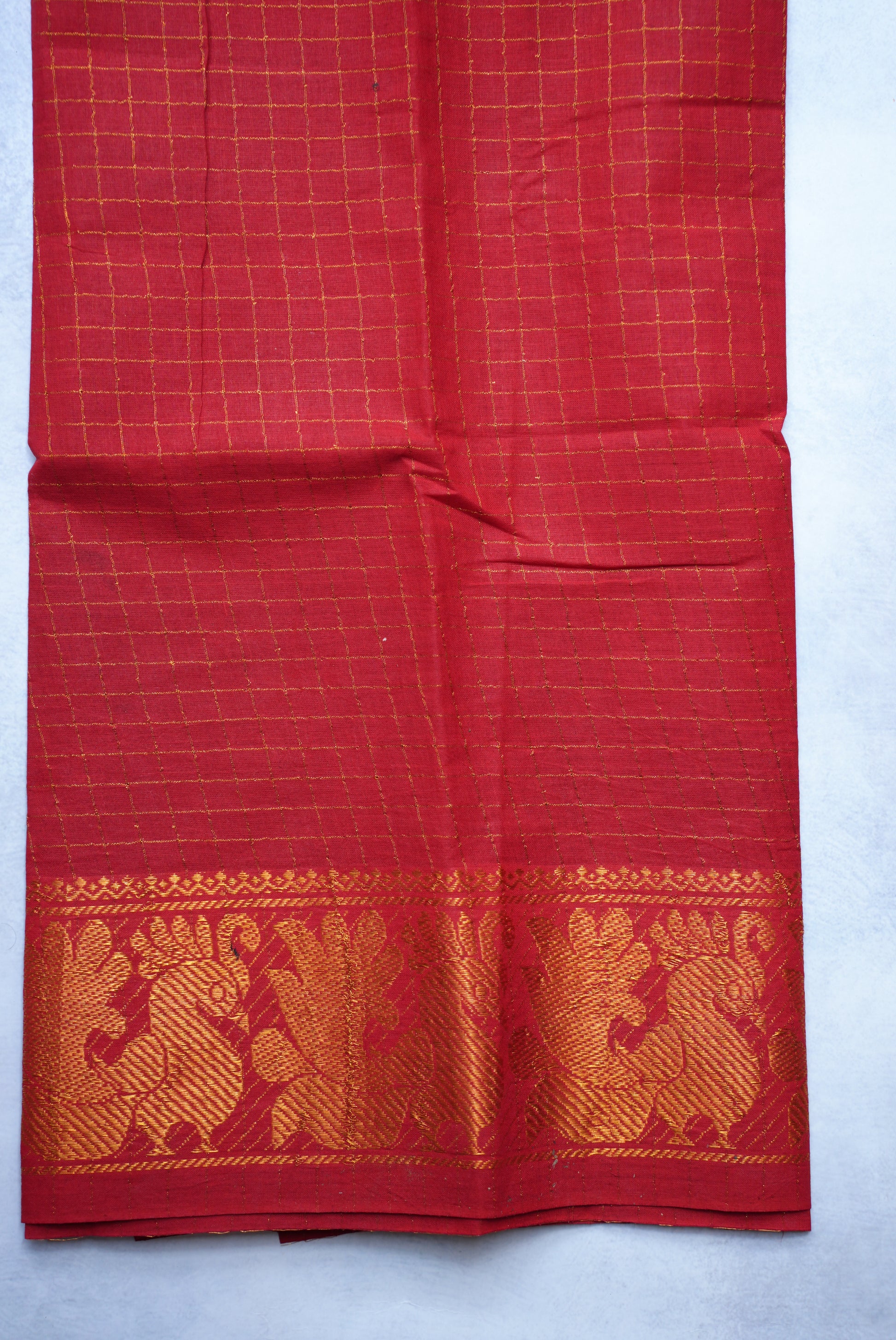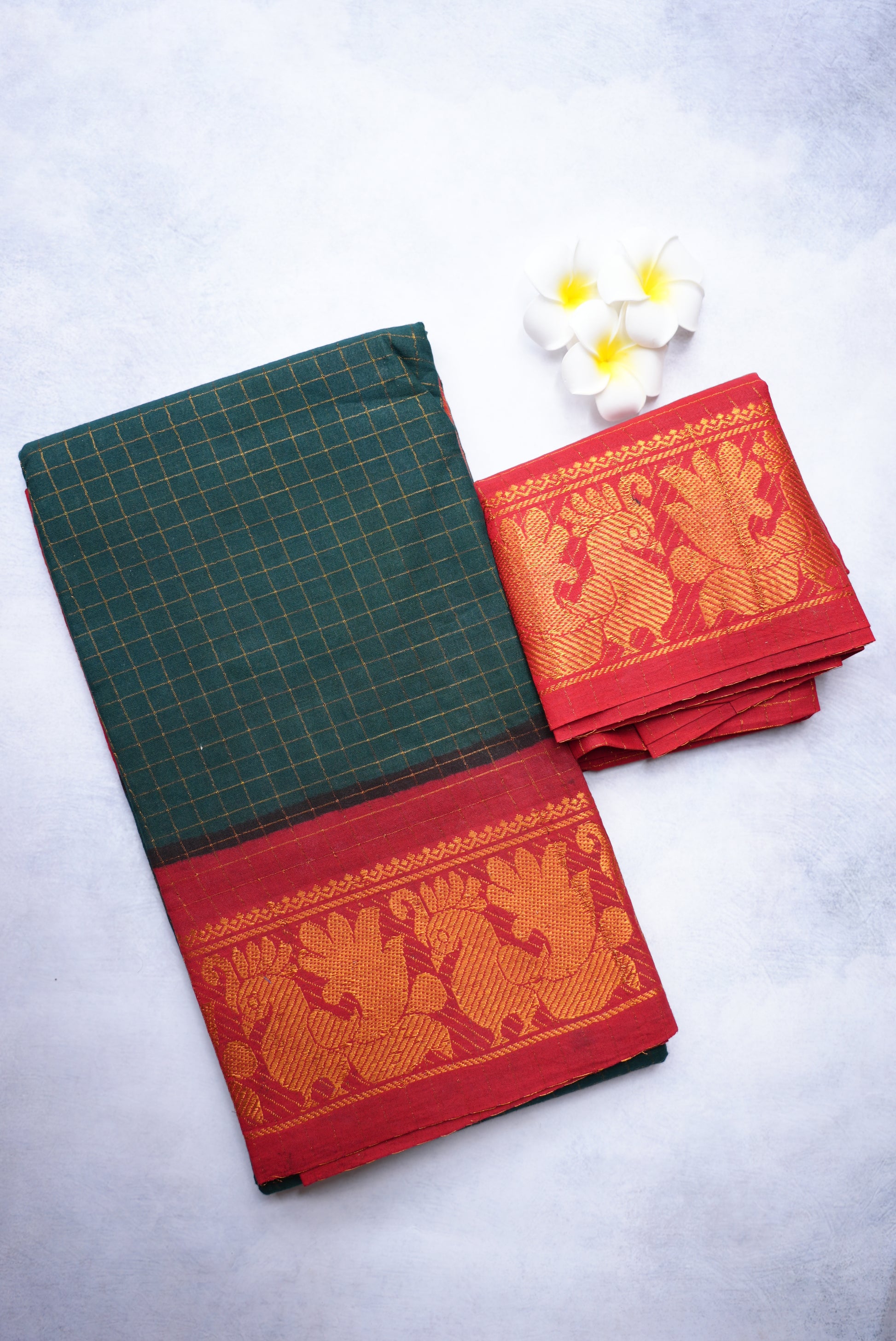 Sungudi Golden Zari Checked Bottle Green Saree with Red Border