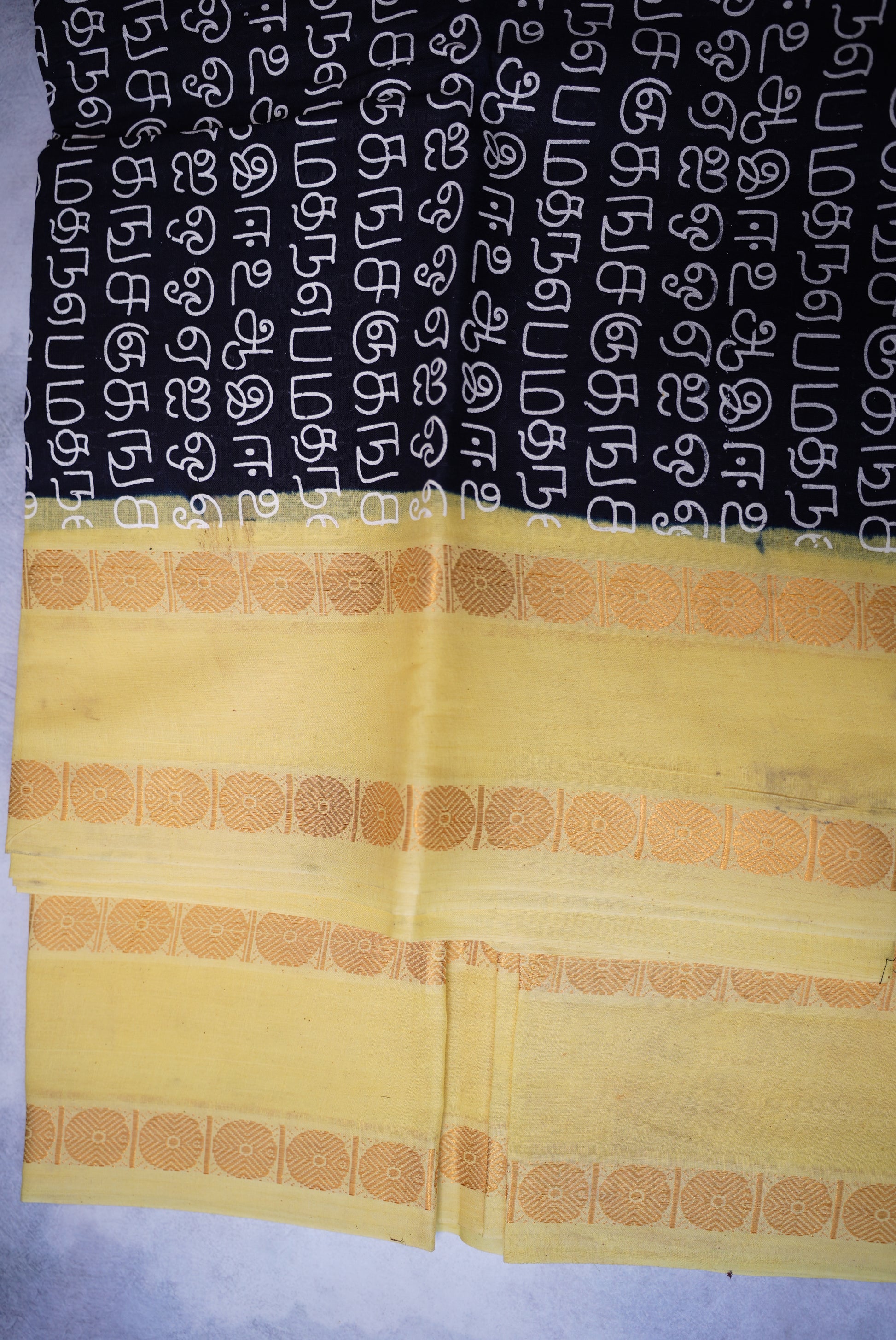 Tamil Letter Printed Sungudi Saree – Black with light Lemon Yellow Border