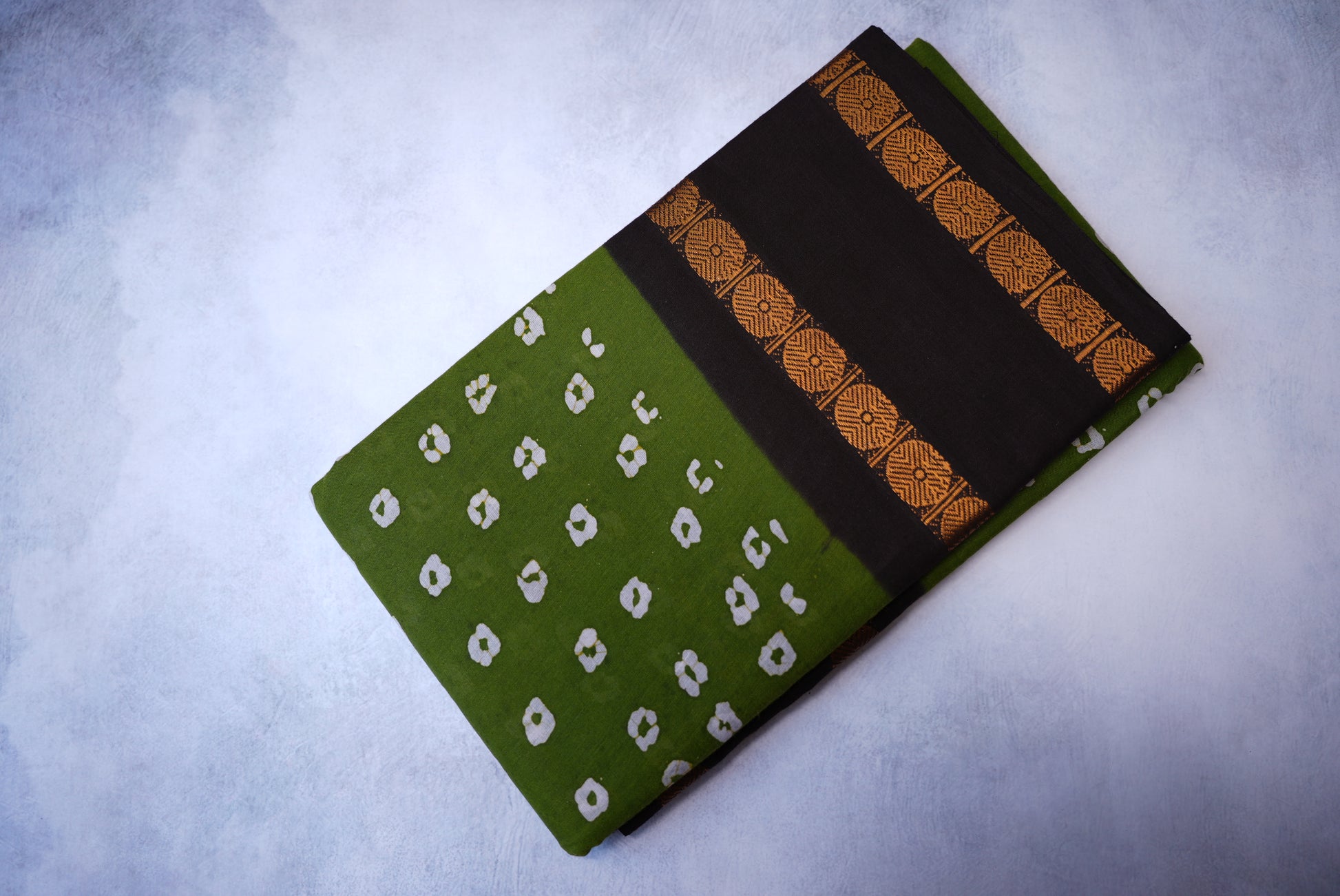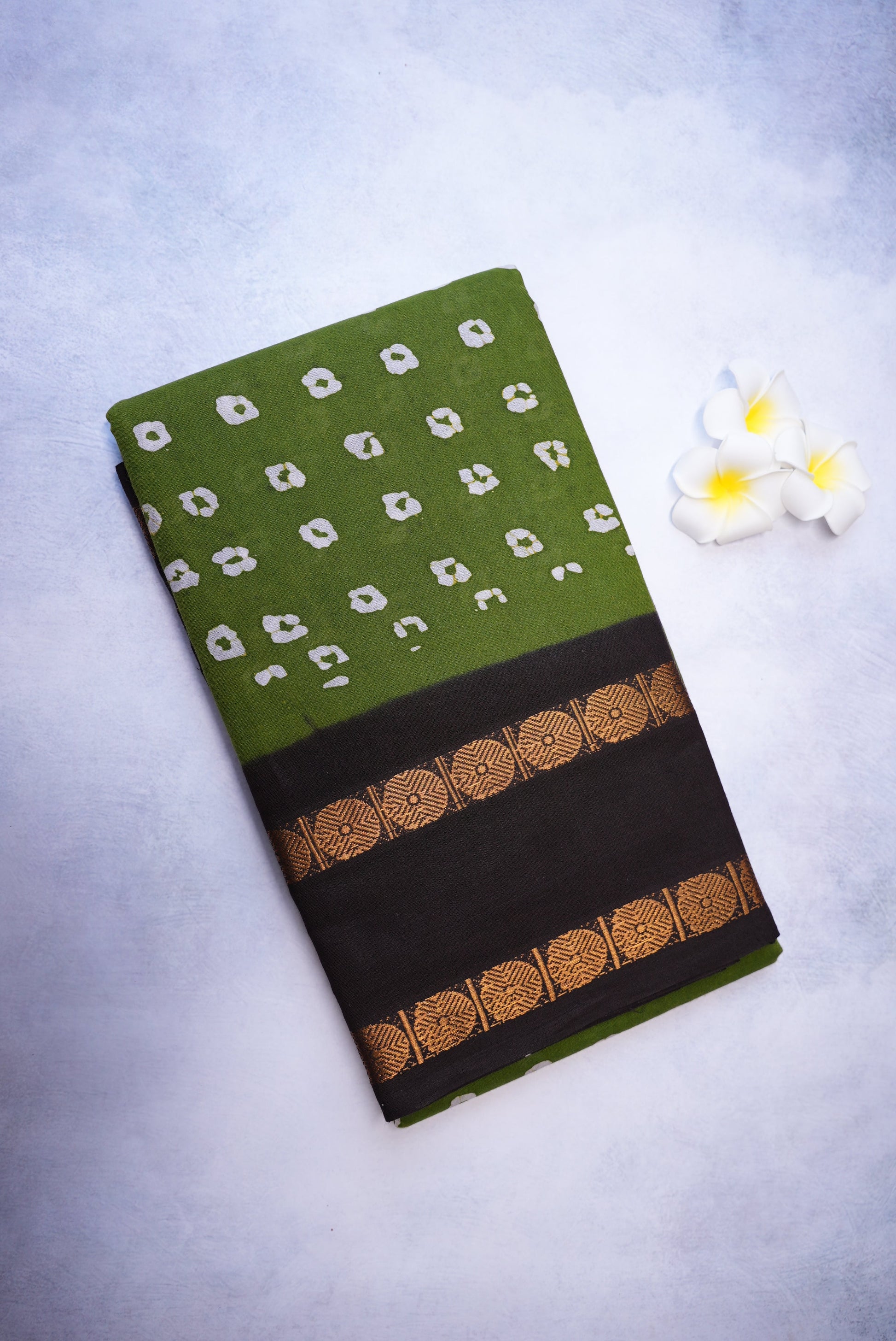 Traditional Batik Print Mehendi Green Block Border Saree with Sungudi Design