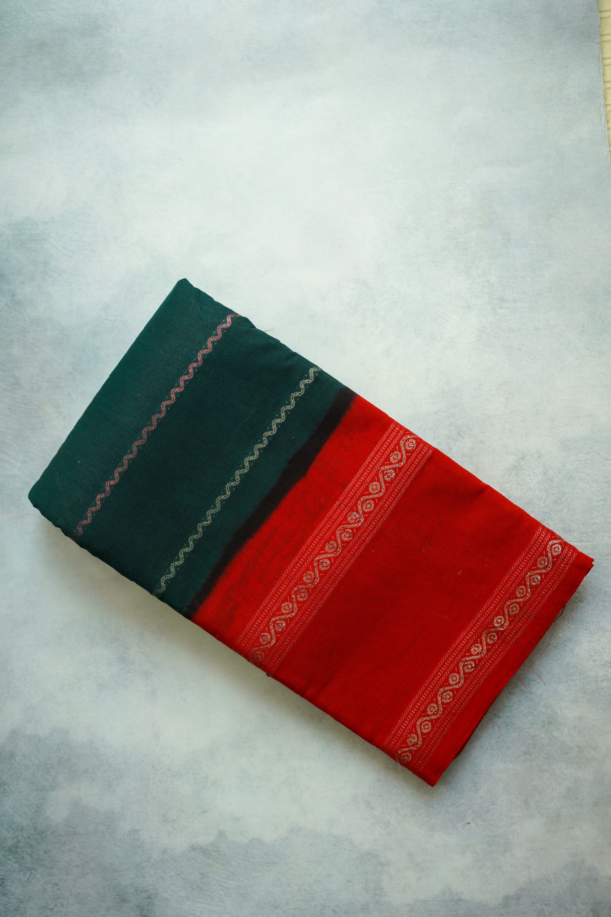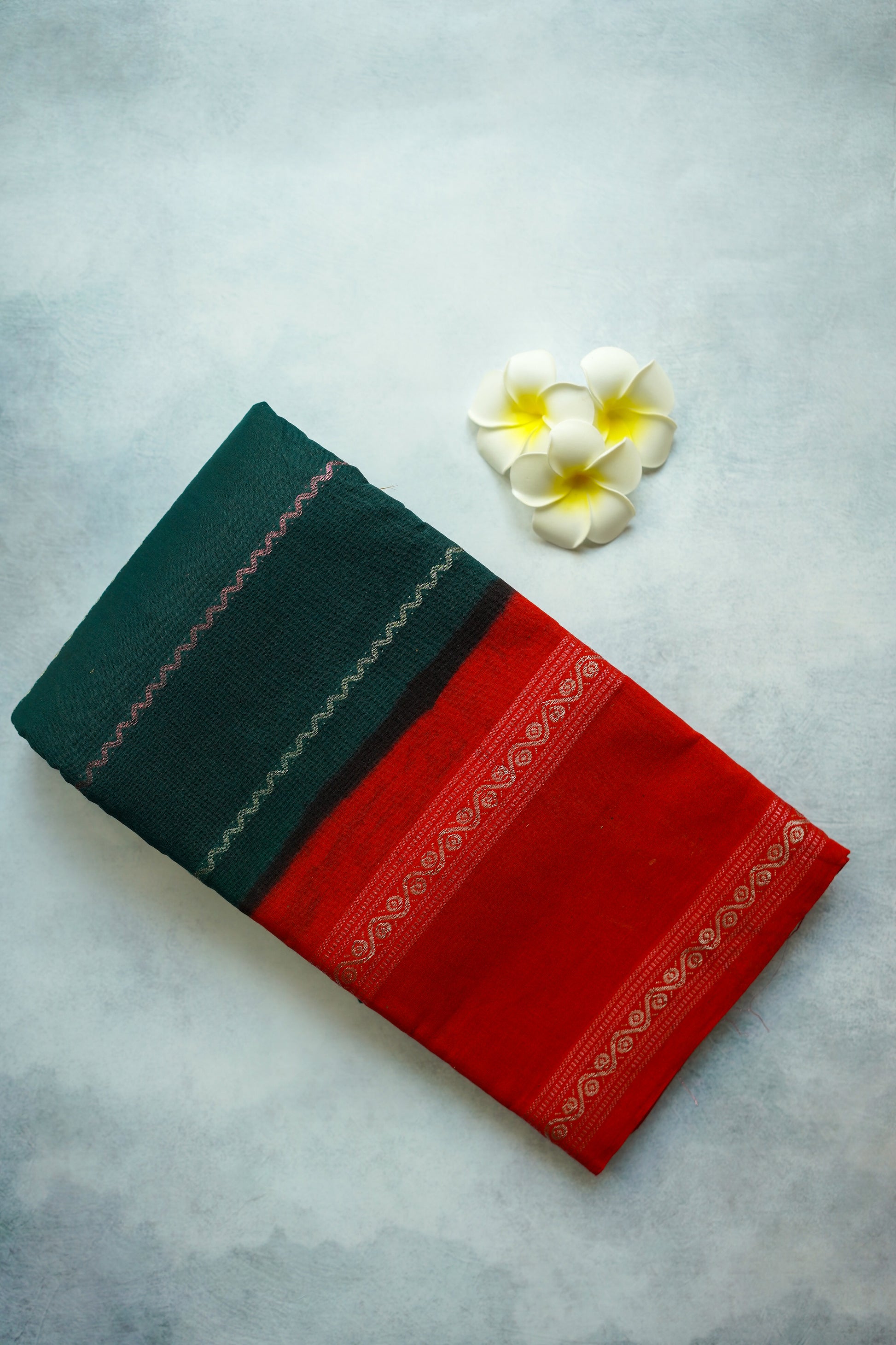 This elegant Velathari Sungudi Saree in dark green is a stunning piece of traditional craftsmanship. The intricate Sungudi tie-dye technique gives the fabric a unique texture, while the Velathari design adds a timeless beauty to the saree. The saree is beautifully bordered with a bold red border, which provides a striking contrast to the deep green, making it perfect for festive occasions and cultural celebrations.